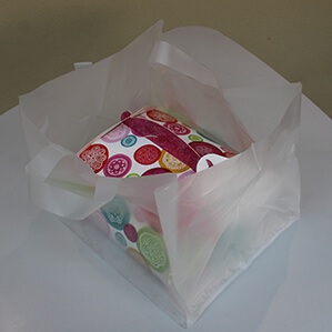 Esta bolsa de aspecto muy original y diseñada a propósito para llevar pasteles de forma práctica y sencilla. Totalmente apta para alimentación.